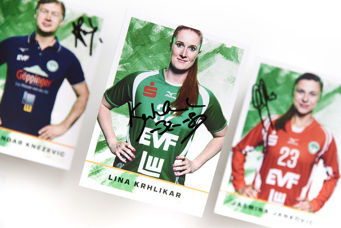 Daraus entwickeln wir Autogrammkarten und das Mannschaftsposter, sowie Spielplakate, Anzeigen für die Tagespresse, das Hallenheft und alles Weitere, was sonst noch anfällt. Das kann ein Großbanner für einen Sponsor sein oder eine Bodenbeklebung für den Spielbetrieb.